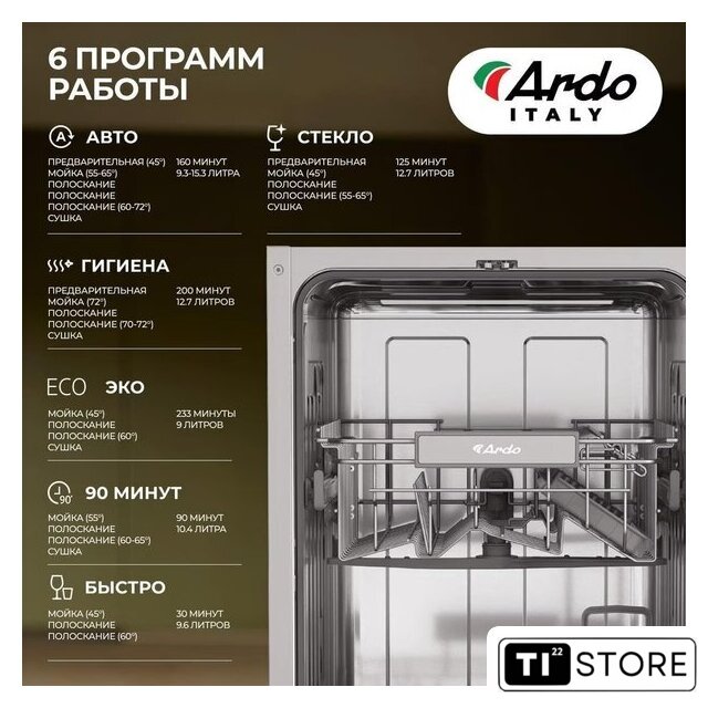 | Дополнительные опции | дополнительная сушка, усиление интенсивности мойки (гигиеническая мойка), половинная загрузка (экономия воды) |
