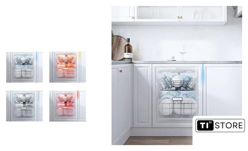 | Дополнительные опции | сокращение времени мойки, дополнительная сушка, усиление интенсивности мойки (гигиеническая мойка), половинная загрузка (экономия воды), программа самоочистки |