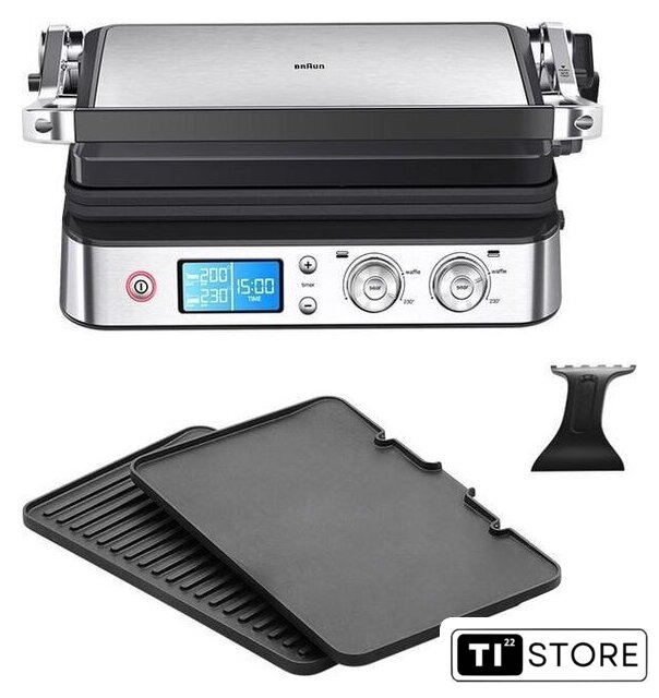 | Комплектация | Электрогриль со съемными нагревательными пластинами: гладкая и ребристая, шпатель |
