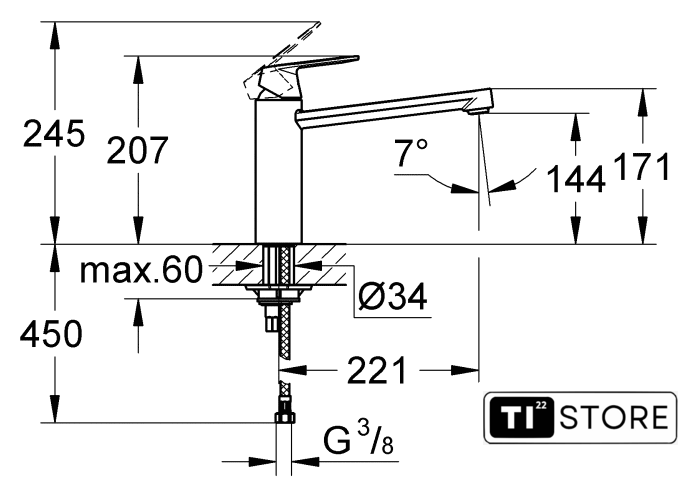 | Длина (вылет) излива | 221 мм |