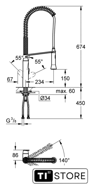 | Поворотный излив | 140 ° |