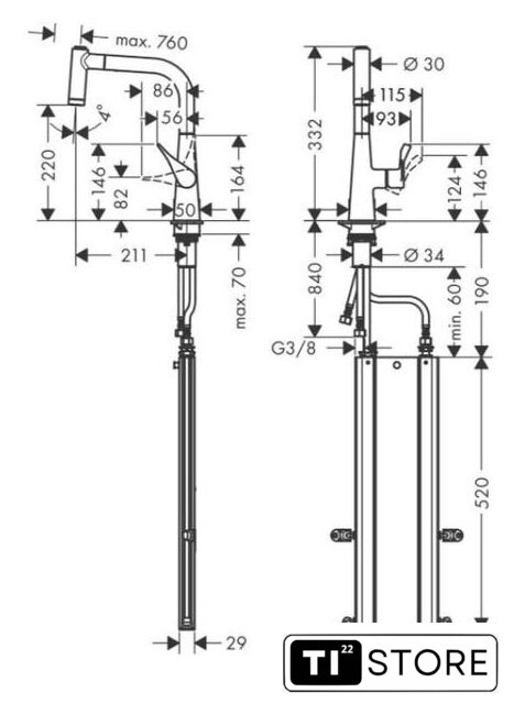 | Поворотный излив | 110 ° (или 150°) |