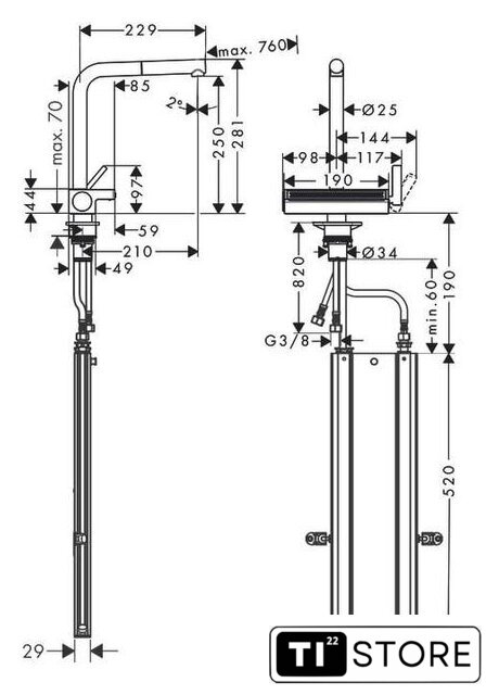 | Поворотный излив | 60 ° (или 110° или 150°) |