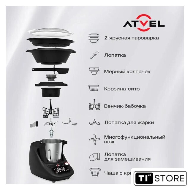 | Полная комплектация | Кухонный роботМногофункциональный ножЛоток пароваркиЛопатка для замешиванияШпиндельКорзина-ситоВенчик-бабочкаЛопаткаЛопатка для жарки |