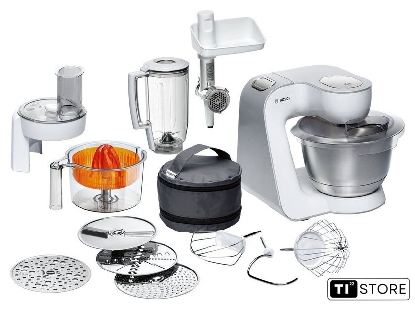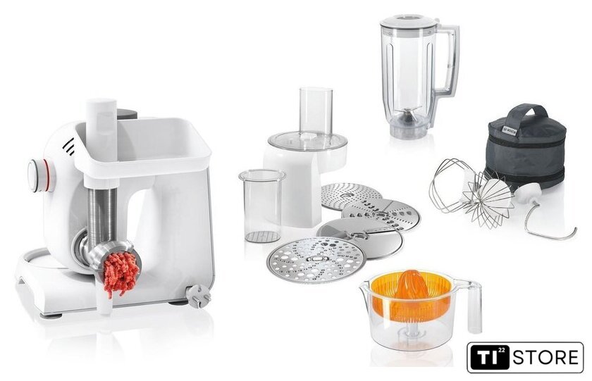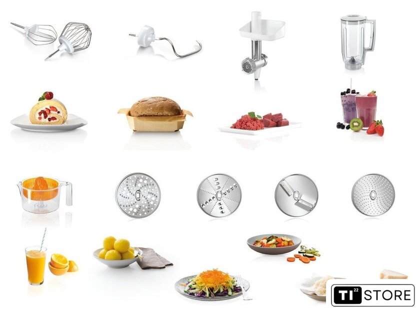| Функции | мясорубка, блендер, цитрус-пресс, взбивание, смешивание, замешивание дрожжевого теста, терка, шинковка, ломтерезка, драники |
