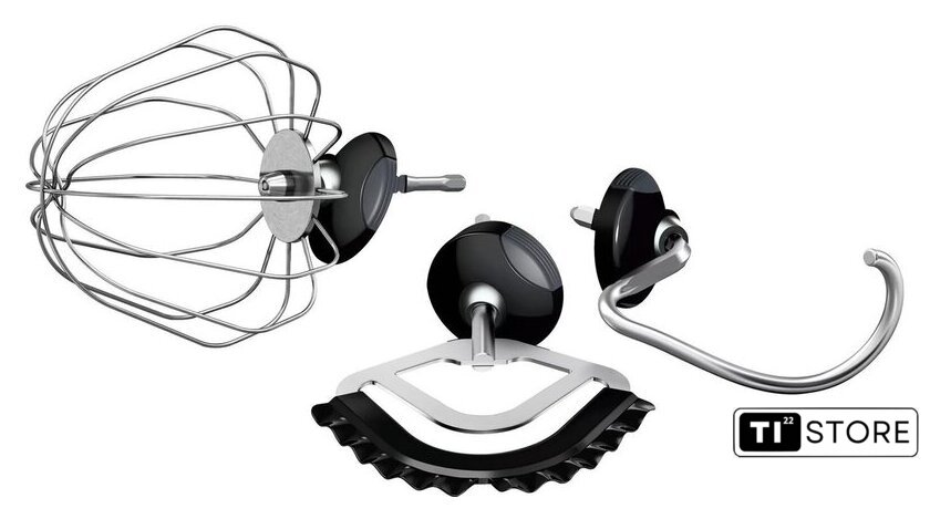| Полная комплектация | Профессиональный набор насадок для получения идеальных результатов: венчик с силиконовым покрытием, объемный венчик для взбивания (с регулировкой высоты), крюк для теста. |