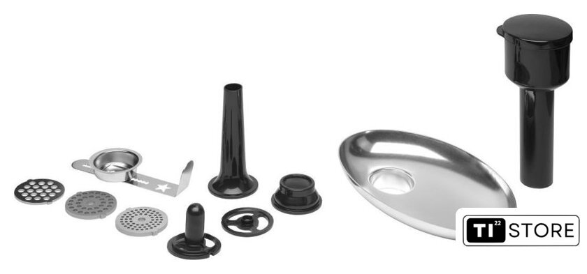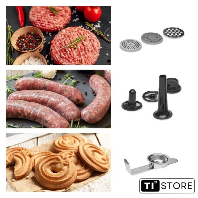 | Полная комплектация | Миска из нержавеющей стали 5 л с ручкой + крышкойВенчикГибкий наконечникМешалкаКрючок для замешиванияМясорубка (3 сменных диска с разной толщиной помола) + аксессуары для фарширования колбас + аксессуары для приготовления печеньяТерка с 5 сменными насадками. |