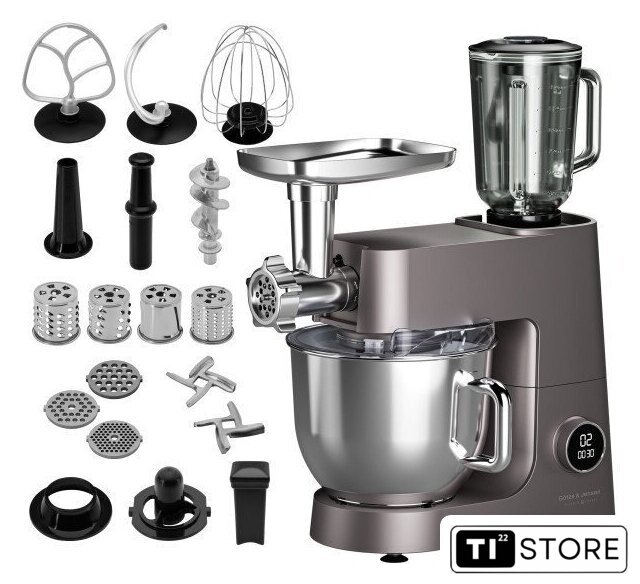 | Полная комплектация | Планетарный кухонный комбайн GÖTZE & JENSEN SB800T, чаша 6 л, чаша 7 л, 2 крышки для чаш, крюк для теста, взбиватель, плоский миксер, измельчитель (толкатель, барабан для измельчения, крупная терка, средняя терка, мелкая терка), мясорубка (корпус, толкатель, лоток, шнек, нож, сито 3 мм, сито 5 мм, сито 7 мм, кольцо, насадка для пюре, насадка для кеббе), чаша блендера, крышка блендера, руководство по эксплуатации с условиями гарантии. |