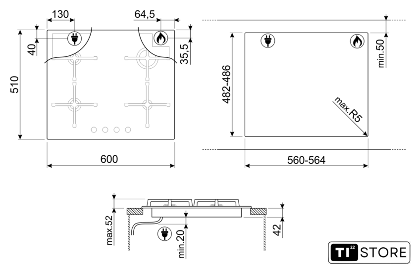 | Трёхуровневые конфорки | нет |