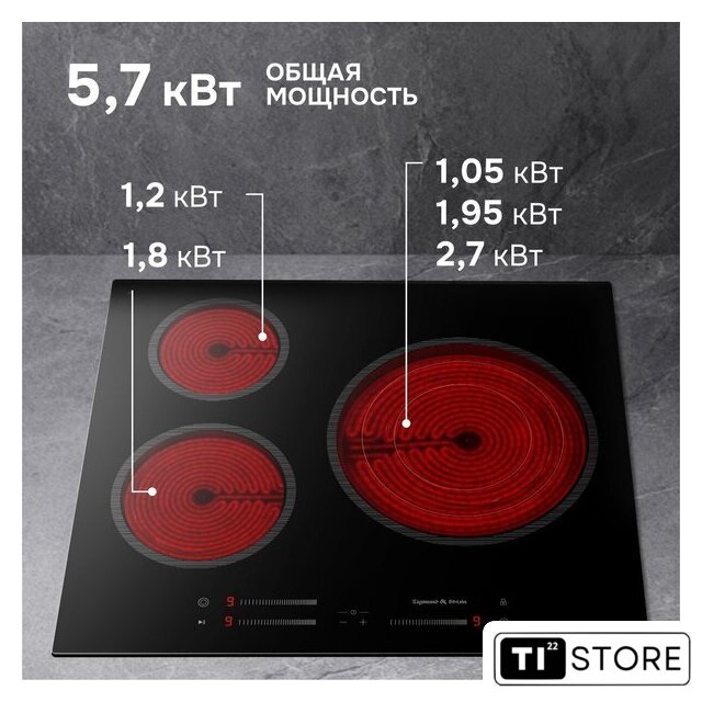 | Подробная информация о конфорках | Ближняя левая 200 мм, 1800WДальняя левая 165 мм, 1200WДальняя правая 150/220/300 мм, 1050/1950/2700W |