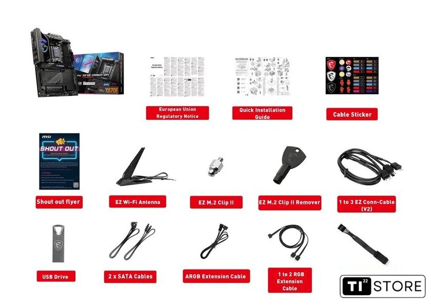 | Комплектация | Board• 1x MotherboardDocumentation• 1x Quick installation guide• 1x European Union Regulatory NoticesApplication• 1x USB driveCables• 2x SATA 6Gb/s cables• 1x 1 to 2 RGB extension cable• 1x ARGB extension cable• 1x 1 to 3 EZ Conn-Cable (V2)• 1x EZ Front panel cableAccessories• 1x EZ Wi-Fi Antenna• 1x Cable sticker• 1x EZ M.2 Clip II• 1x EZ M.2 Clip II Remover |