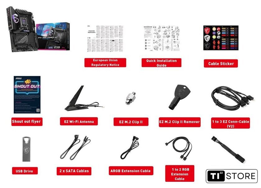 | Комплектация | - EZ Wi-Fi антенна - USB Flash накопитель - стикеры для кабелей- 2 кабеля SATA- EZ кабель фронтальной панели- 1EZ - 3EZ кабель - 1RGB - 2RGB кабель-удлинитель - ARGB кабель-удлинитель- ключ-экстрактор EZ M.2 Clip II - винт со стойкой EZ M.2 Clip II- документация |