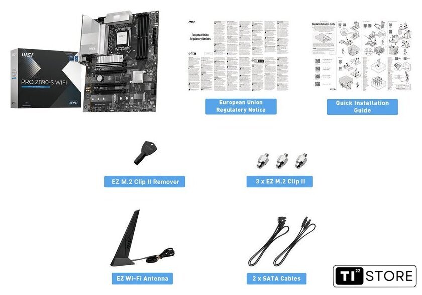 | Комплектация | - EZ Wi-Fi антенна - 2 кабеля SATA- ключ-экстрактор EZ M.2 Clip II - 3 винта со стойкой EZ M.2 Clip II- документация |