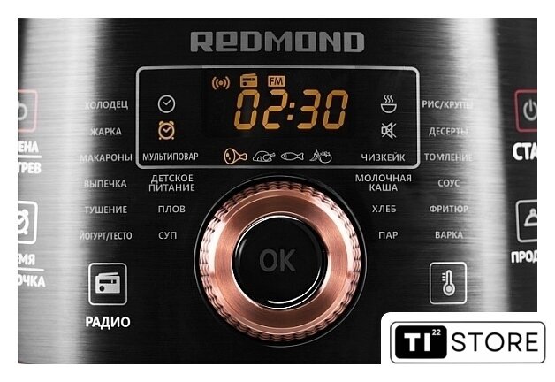 | Режимы приготовления | варка, выпечка, десерт, детское питание, жарка, йогурт, крупа, макароны, молочная каша, пароварка, плов, рис, суп, тесто, томление, тушение, фритюр, хлеб, холодец (чизкейк, соус, экспресс) |