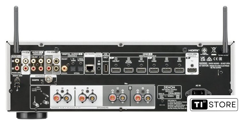 AV ресивер, 2 канала, 100 Вт/8 Ом, 120 Вт/6 Ом, выходы 2.2, КНИ 0.03%, SNR 98 дБ, USB, LAN, BT, Wi-Fi