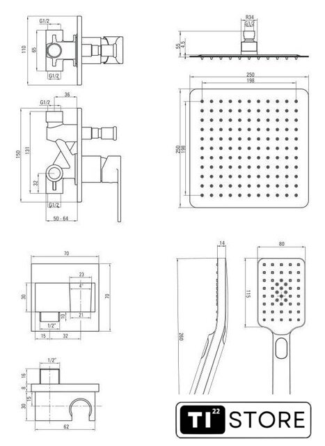 | Диаметр (ширина) верхнего душа | 250 мм |