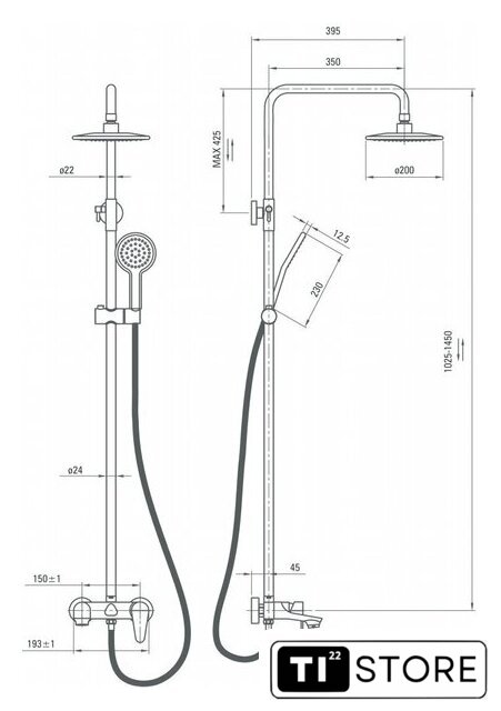 | Комплектация | верхний душ, штанга, ручной душ (лейка), держатель лейки, шланг, смеситель, излив для ванны |