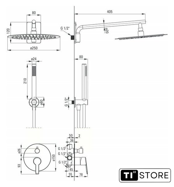 | Диаметр (ширина) верхнего душа | 250 мм |