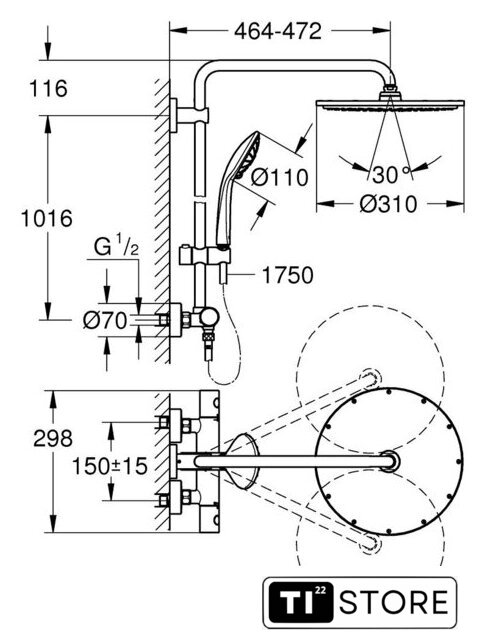 | Диаметр (ширина) верхнего душа | 310 мм |