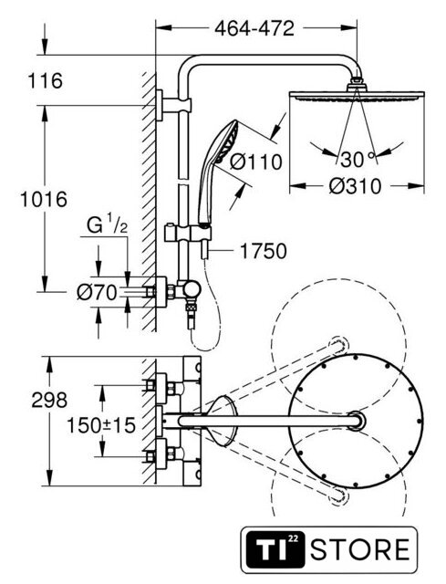 | Диаметр (ширина) верхнего душа | 310 мм |