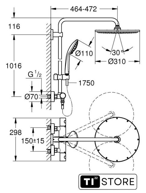 | Диаметр (ширина) верхнего душа | 310 мм |