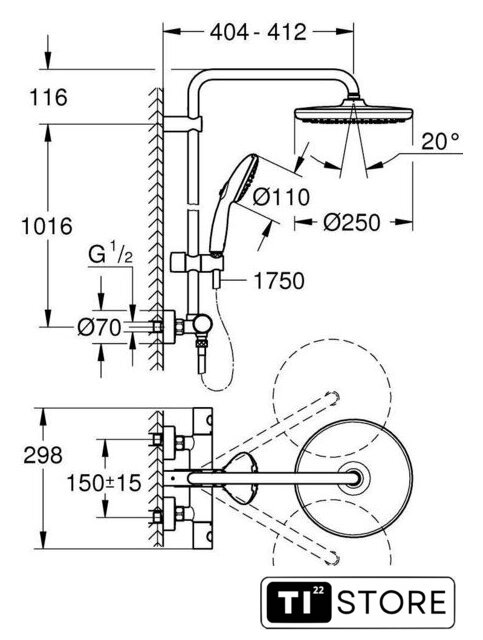 | Вылет верхнего душа | 404 мм |