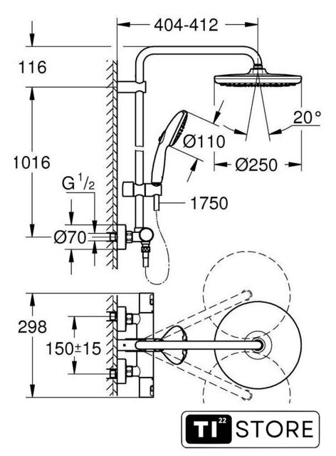 | Диаметр (ширина) верхнего душа | 250 мм |