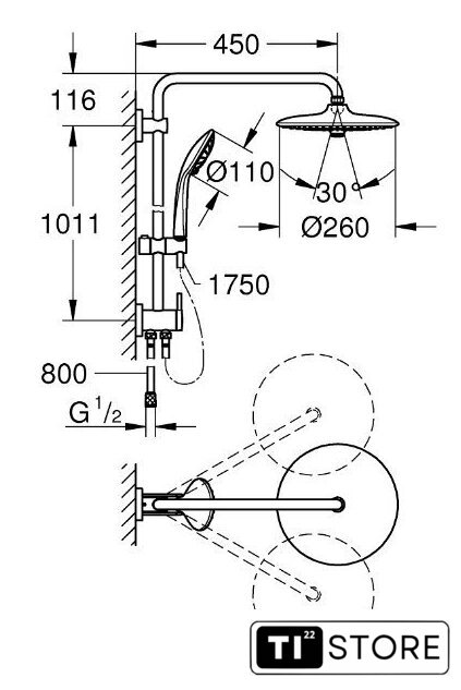 | Диаметр (ширина) верхнего душа | 260 мм |
