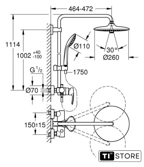 | Вылет верхнего душа | 472 мм |