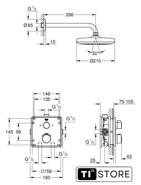 | Диаметр (ширина) верхнего душа | 210 мм |