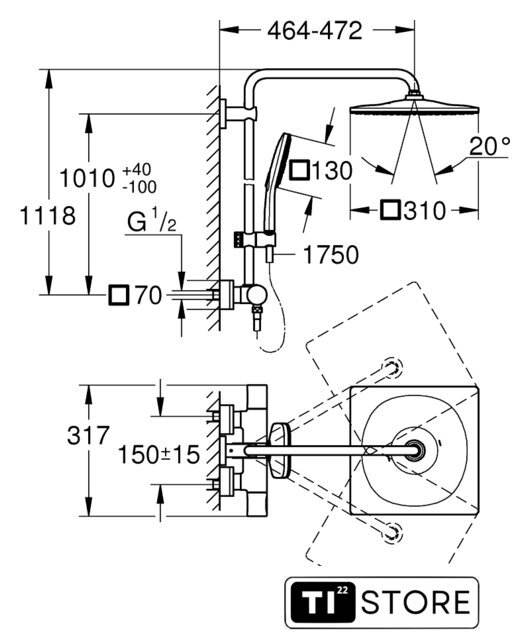 | Вылет верхнего душа | 464 мм (464 - 472 мм) |