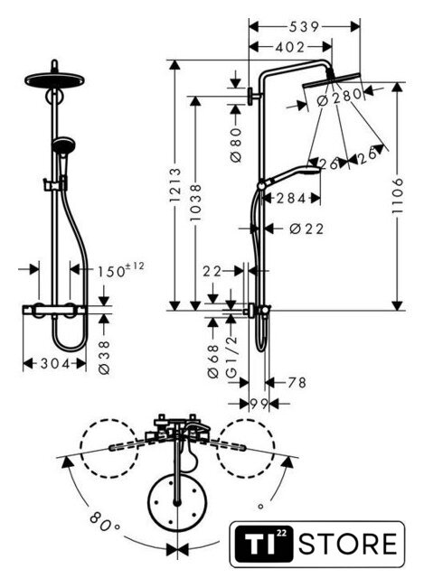 | Диаметр (ширина) верхнего душа | 280 мм |