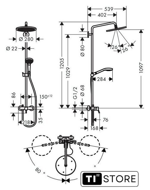 | Диаметр (ширина) верхнего душа | 280 мм |