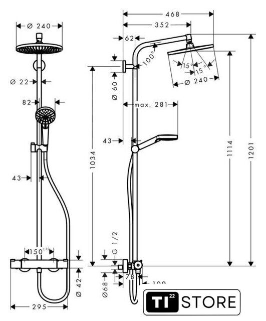 | Диаметр (ширина) верхнего душа | 240 мм |