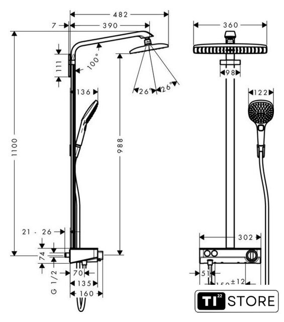 | Диаметр (ширина) верхнего душа | 360 мм |