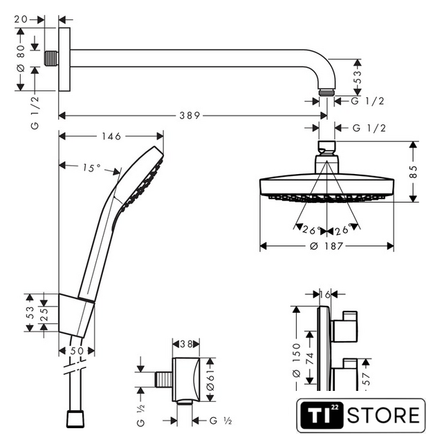| Диаметр (ширина) верхнего душа | 180 мм |