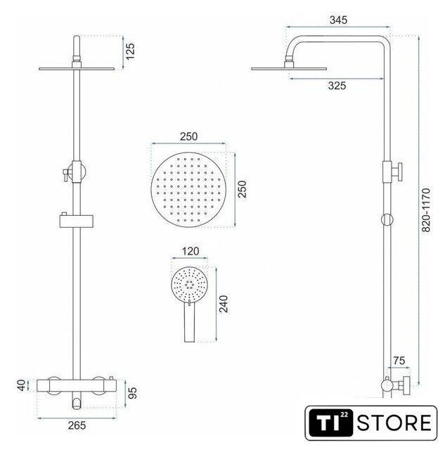 | Комплектация | верхний душ, штанга, ручной душ (лейка), держатель лейки, шланг, смеситель, излив для ванны |