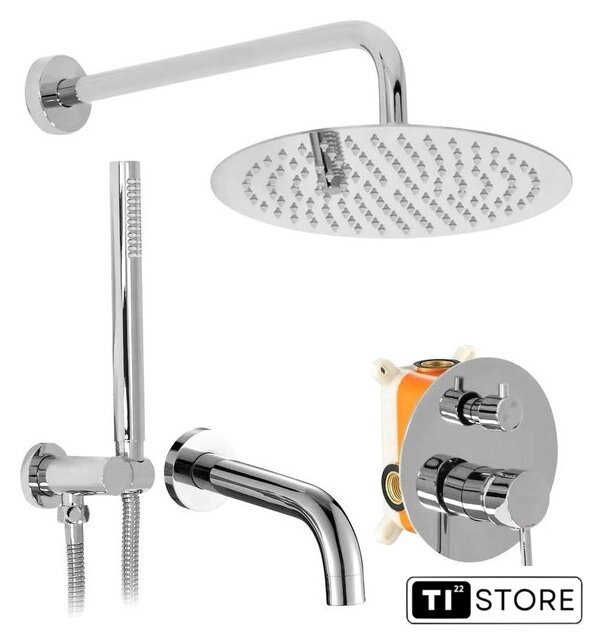 | Комплектация | верхний душ, ручной душ (лейка), держатель лейки, шланг, смеситель, излив для ванны |