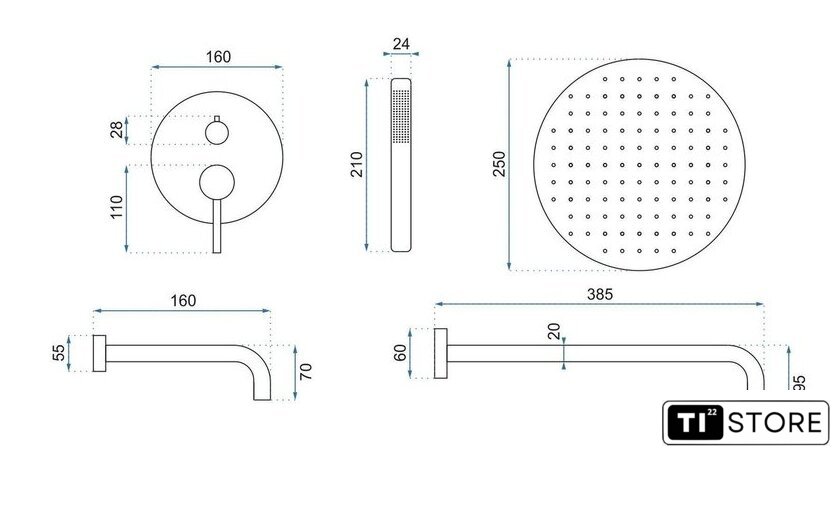 | Диаметр (ширина) верхнего душа | 250 мм |