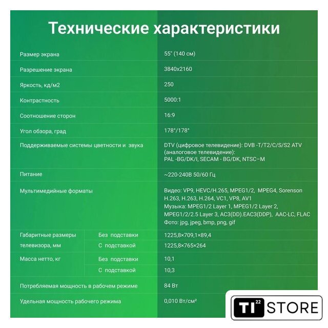 | ТВ-тюнер | аналоговый, DVB-C, DVB-T, DVB-T2, DVB-S/S2 |